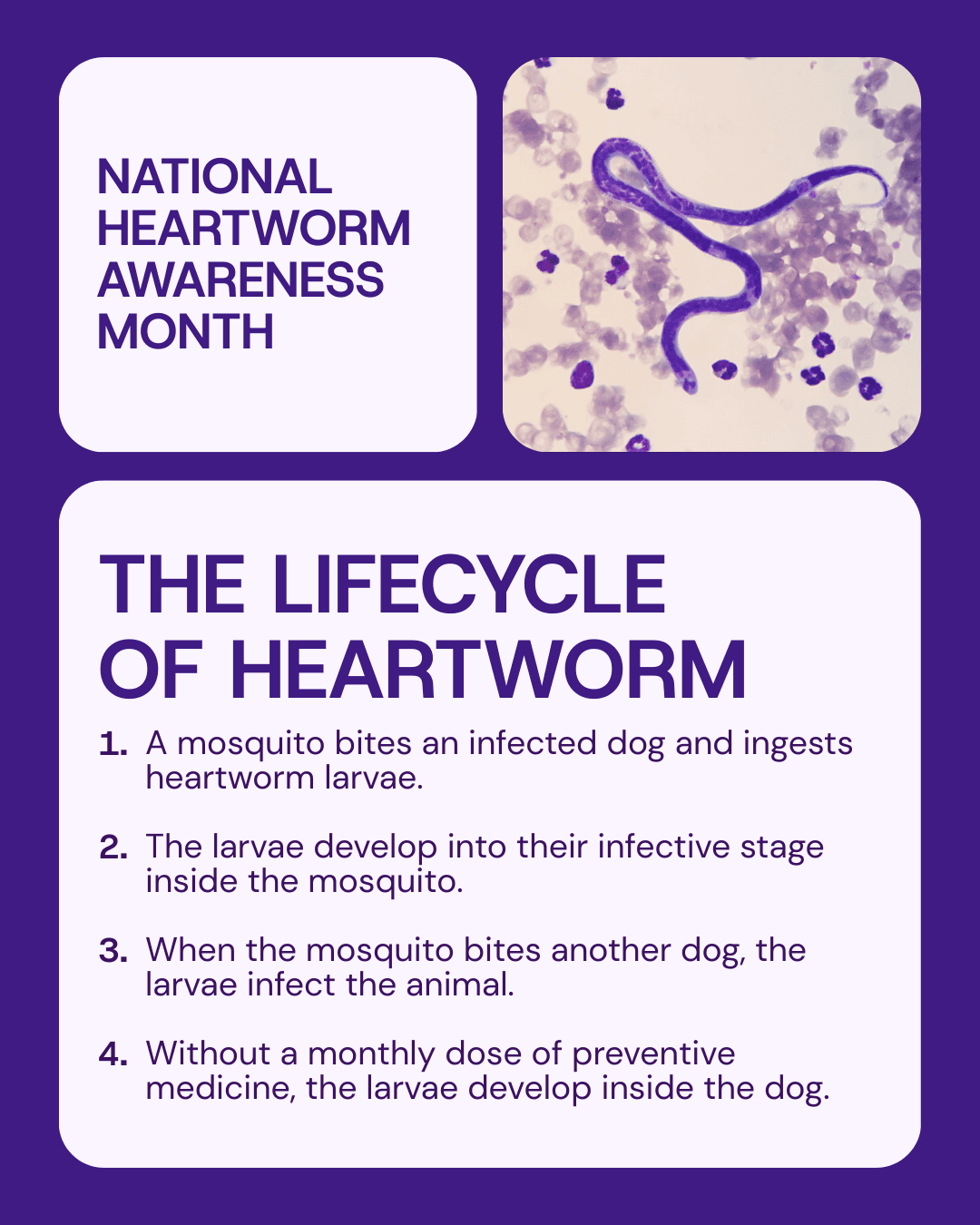 1. National Heartworm Awareness Month: Does your community know how serious heartworm disease can be for pets? Raise awareness about the importance of preventive veterinary care throughout the month of April by sharing tips and best practices for keeping your followers’ pets healthy, like which warning signs they can watch out for and why they need to get their pets tested for heartworms annually.