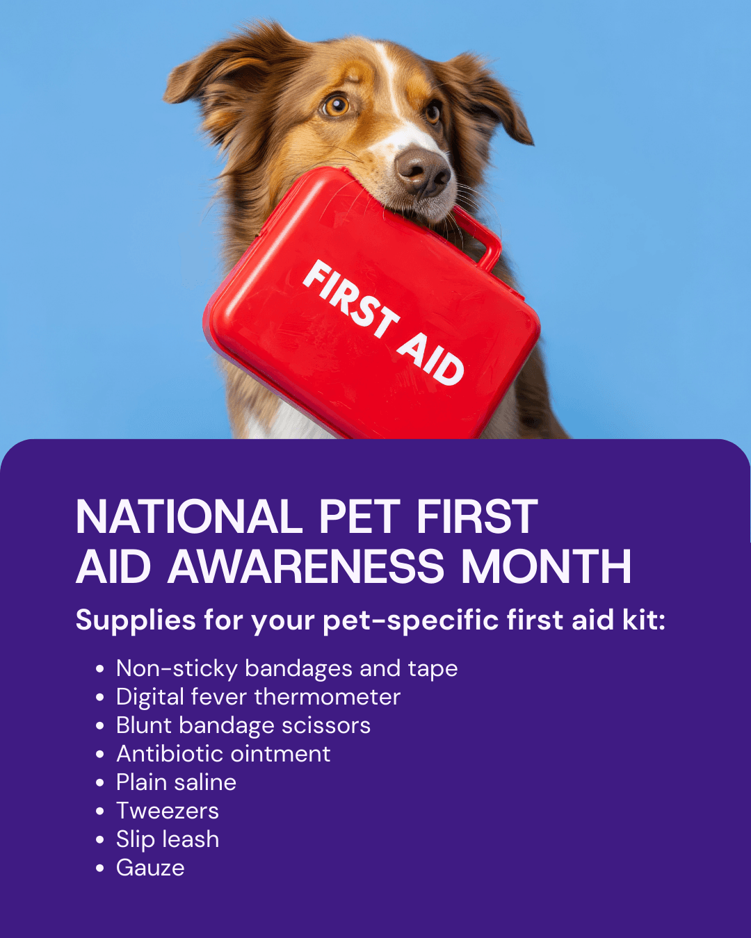 3. National Pet First Aid Awareness Month: Use social media to remind your online followers about the importance of pet first aid, and educate them on how to be prepared for sudden pet emergencies. Use our social media graphic and emphasize the need to create and maintain a pet first aid kit with essential supplies, including gauze and antibiotic ointment. You should also use this time to remind pet parents about the need to keep pet vaccinations up to date, and encourage them to book a routine check-up online.